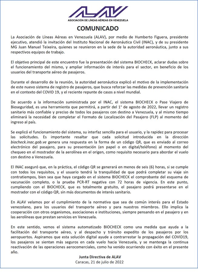La Asociación de Lineas Aéreas de Venezuela, ALAV, informó a través de un comunicado que sostuvieron una reunión con el Instituto Nacional de Aeronáutica Civil (INAC), para conocer sobre el nuevo sistema Biochek que emitirá un pase de viajero para ingresar al país, el cual será de carácter obligatorio a partir del primero de julio de 2022.