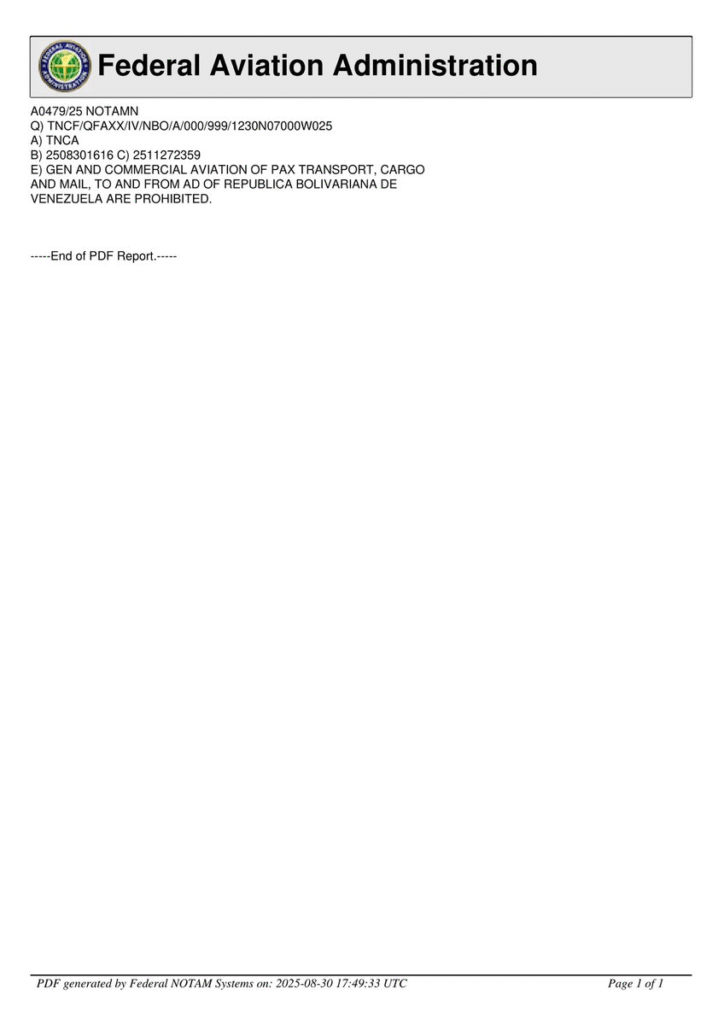 El abogado aeronáutico Guillermo De Armas informó en sus redes sociales de la decisión y señaló que la prohibición está formalizada bajo la NOTAM A0479/25 del Aeropuerto Internacional Reina Beatrix.