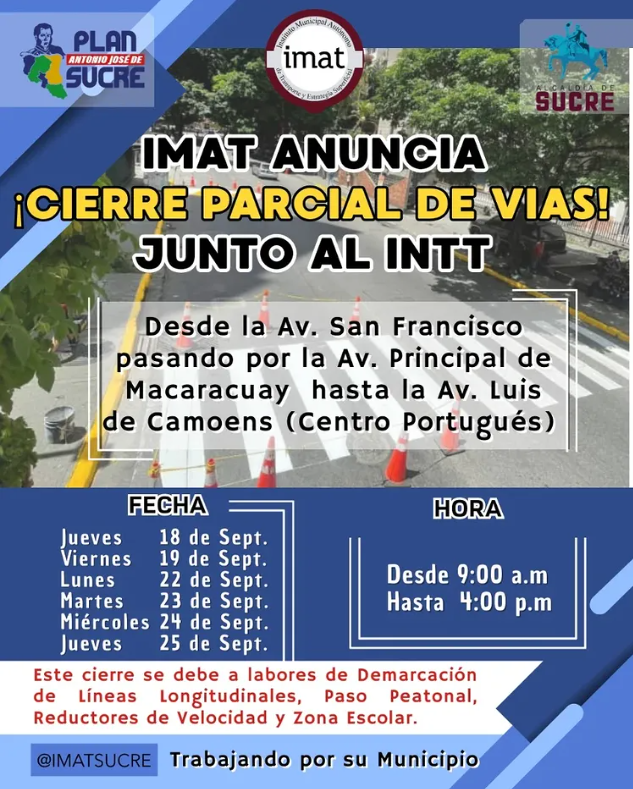 La Alcaldía del municipio Sucre del estado Miranda, a través del Instituto Municipal Autónomo de Transporte (IMAT), informó que cerrarán parcialmente la vía desde la Av. San Francisco, pasando por la Av. Principal de Macaracuay, hasta la Av. Luis de Camoes (Centro Portugués), por trabajos de demarcación de las vías.