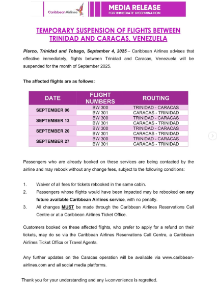 Caribbean Airlines anunció este jueves la suspensión inmediata de todos los vuelos entre Trinidad y Caracas durante el mes de septiembre de 2025.