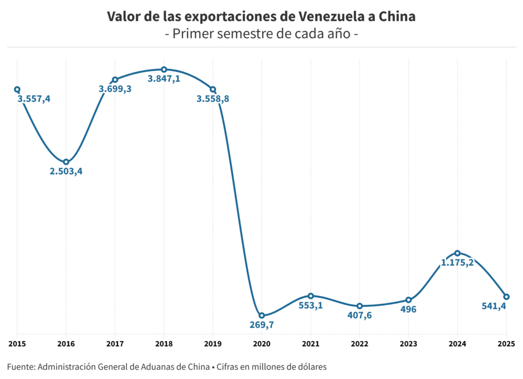 La caída del comercio entre los dos países se explica por un fuerte descenso de las exportaciones. Los números oficiales de China indican que Venezuela exportó a ese país mercancías por un monto de 541,4 millones de dólares entre enero y junio de este añoun descenso de 54% en comparación con el mismo lapso de 2024.