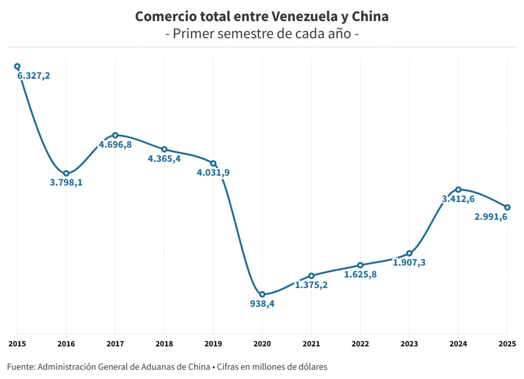 El comercio entre Venezuela y China totalizó 2.991,6 millones de dólares en el primer semestre de 2025una caída de 12%, en contraste con igual lapso de 2024, de acuerdo con datos de la Administración General de Aduanas del país asiático.