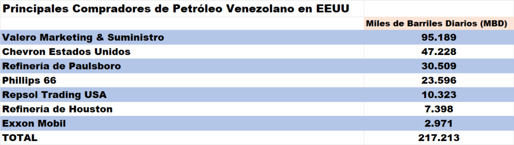 Refinería Valero Energy fue el principal comprador de crudo venezolano en Estados Unidos en el período, representando el 44% del total, seguido por la petrolera Chevron con un 22%. PBF Energía compró alrededor del 14% del crudo.