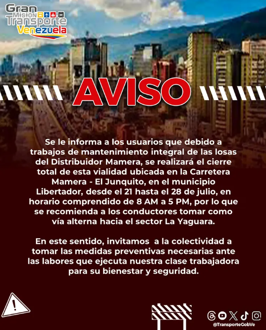 En sus redes sociales, el equipo del Ministerio del Poder Popular para el Transporte recomendó a los conductores que usualmente utilizan la carretera Mamera-Junquito a tomar como vía alterna la vía tradicional que parte desde el sector La Yaguara.