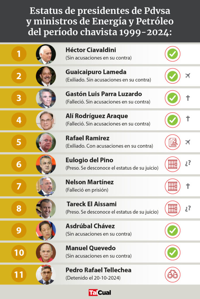 Con la detención de Tellechea, han sido arrestados o acusados por irregularidades cinco de los 11 presidentes que ha tenido Petróleos de Venezuela desde 1999 con la llegada al gobierno de Hugo Chávez y hasta 2024 con el gobernante Nicolás Maduro. A lo que se suma los cientos de funcionarios de más alto nivel de la empresa estatal, muchos de ellos integrantes de las diversas juntas directivas y directores de las filiales de Pdvsa en el país y en el exterior, involucrados en irregularidades.
