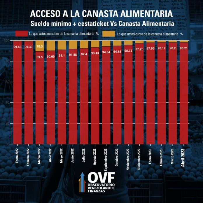 En la presentación, el OVF indicó que al comparar el costo de esa canasta con las remuneraciones promedio del sector privado en abril (142 mensuales) se aprecia que los ingresos solo cubrieron 36% del valor de la cesta de alimentos.