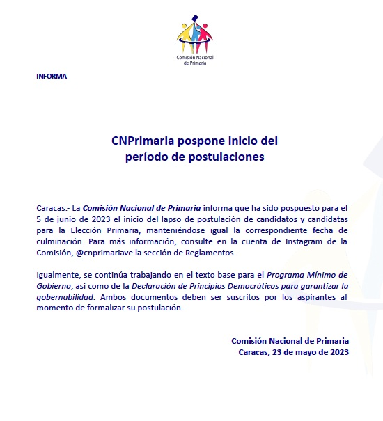 La Comisión Nacional de Primaria informó que el inicio del período de postulación de candidatos y candidatas a la Elección Primaria ha sido pospuesto para el 5 de junio de 2023.